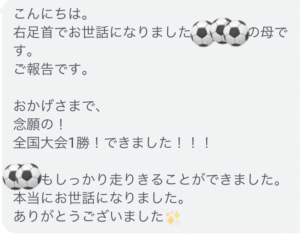 中学生サッカー全国大会に出場した子のお母様から嬉しいご報告をLINEでいただきました。
