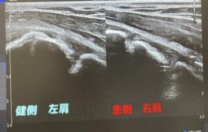 野球肩を確認する徒手検査をした際に痛みがあり、エコーで確認する事となりました。※エコーの説明をみる