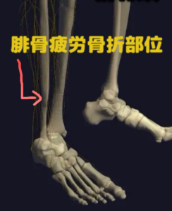 初見時、下腿部外側の腓骨上に限局性圧痛、軸圧痛があり、腓骨疲労骨折を疑います。