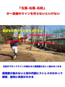 トップで肘が下がっていると上の写真のようにボールリリース時、斜め一直線のラインが作れず肘の靱帯へ大きな負担となります。