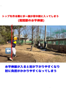 ↑上の写真では、テイクバック時に右腕が背中側に入りすぎています。これが影響してトップを作る際右肘が右肩まで上がりきらず肘が低いまま投げて内側側副靱帯を痛めてしまいます。