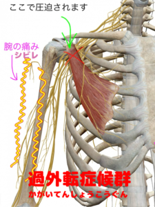 過外転症候群とは、小胸筋という胸の筋肉の下で神経や血管などが圧迫され、腕や手の痺れ、だるさ、脱力感じなどがでる疾患です。